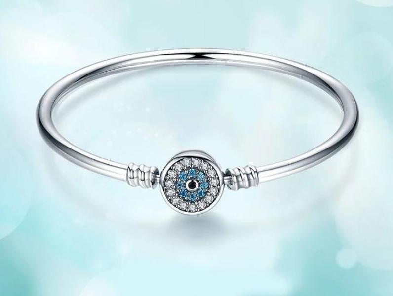 A Hamsa "Evil Eye" protector charm paved in clear and pale blue Cubic Zirconia set centre of a fine silver round bangle, worn by many cultures for the protective quality it is believed to carry for the wearer.