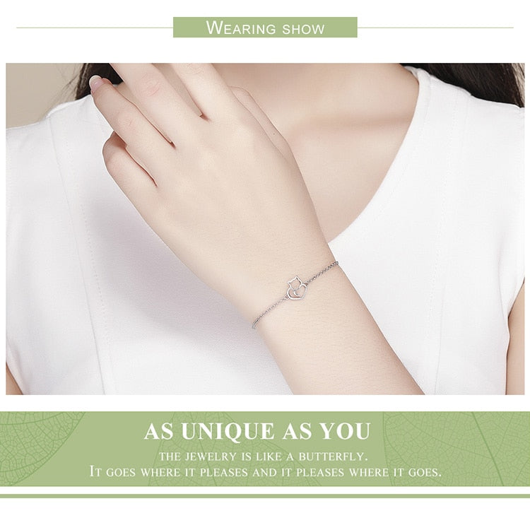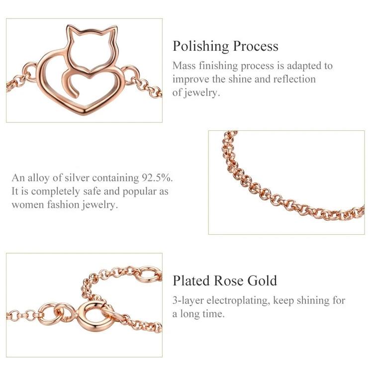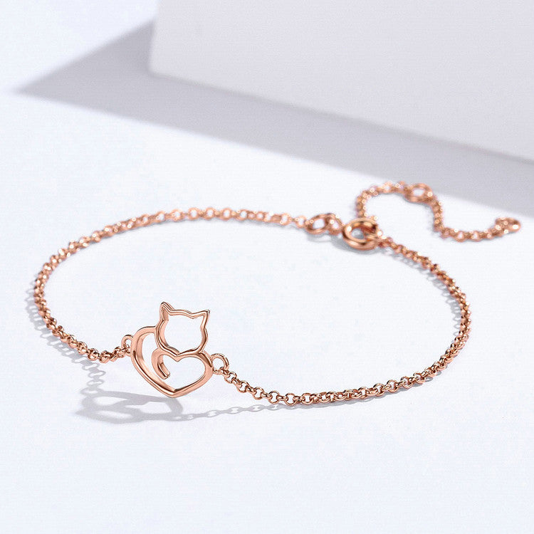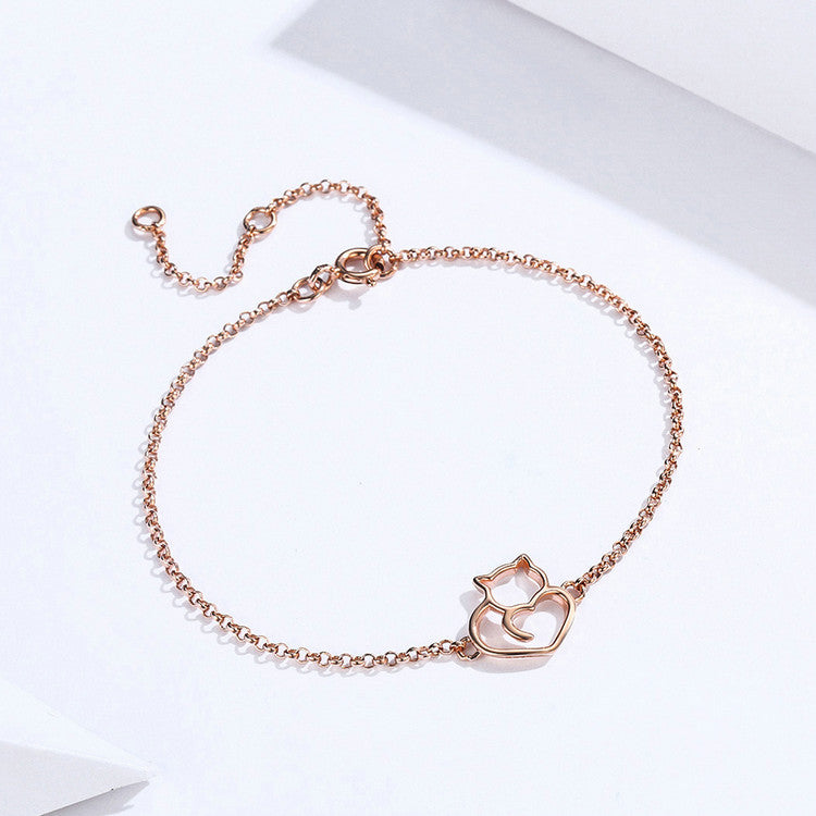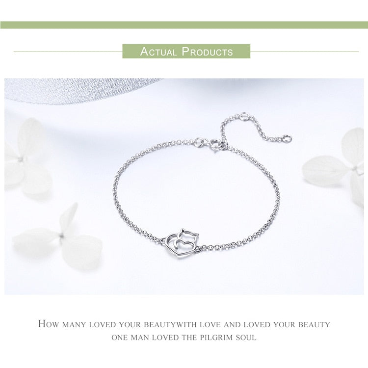 Sterling Silver or Rose Gold finish chain link bracelet with a single curled up kitty cat charm with a heart shaped centre, a wonderful gift for the cat lover in your world!.