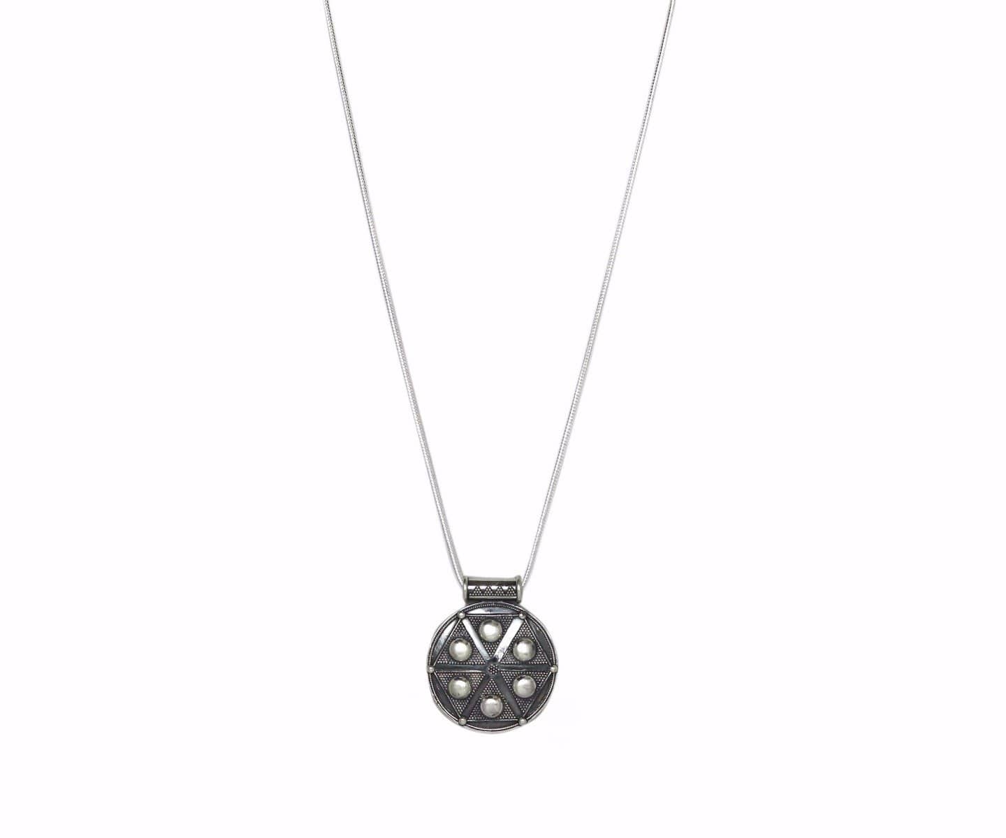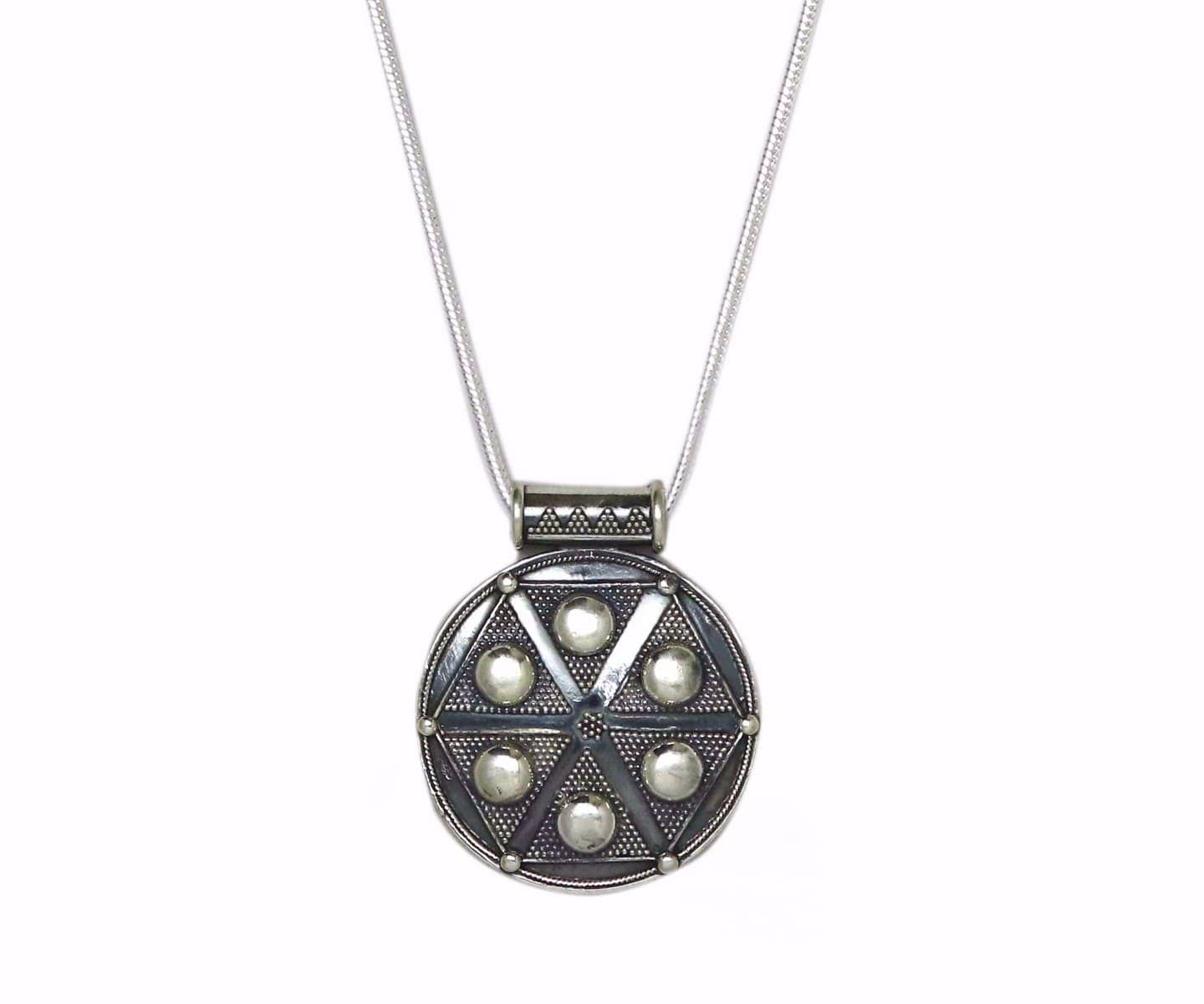 This sterling silver d circle pendant necklace is an elegant addition to your vintage style. The handcrafted silver features large circular designs, and adds a boho-inspired touch no matter the outfit or occasion. A great pendant to make a statement to your unique style.