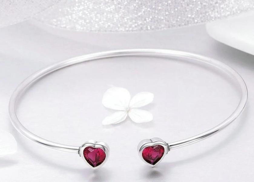 Cute and bright dual heart open cuff Sterling Silver bracelet featuring twin ruby red Cubic Zirconia hearts. Why not surprise the one you love with a sweet reminder?