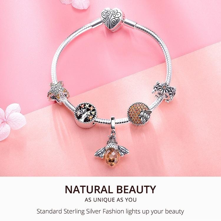 Eclectic warm toned charms set on a Sterling Silver rope bracelet for a beautiful contrast, including an amber toned Starfish, Tree of Life, Large Honeybee, Honeybee with Honey and Daisy Chain, as well as a Silver heart hidden clasp.