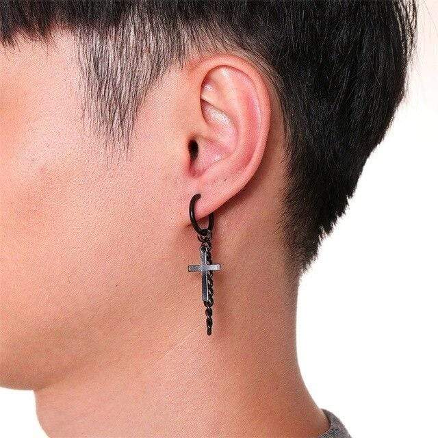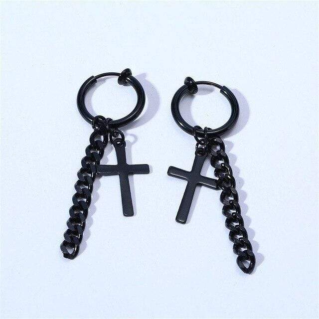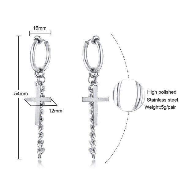 Edgy and unique, these cross earrings are made from high quality steel and feature a contemporary design. The earrings are hooped and feature a single chain and a delicate cross charm.