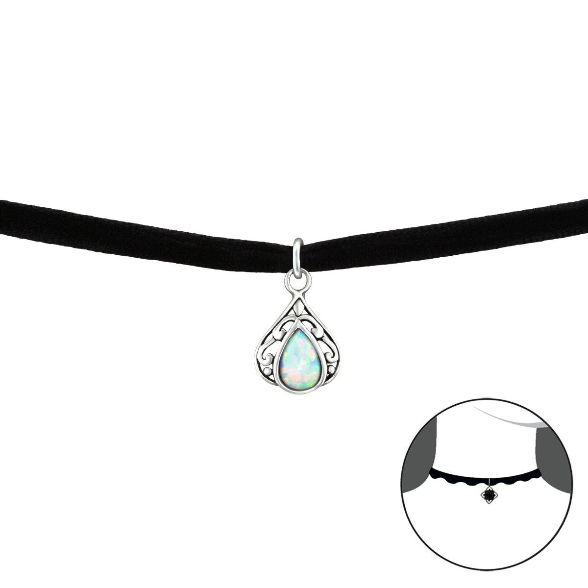 A true standout, this choker will get you noticed no matter where you go. The thick black band of the choker holds the sterling silver cut-out charm which holds a stunning faux opal.
