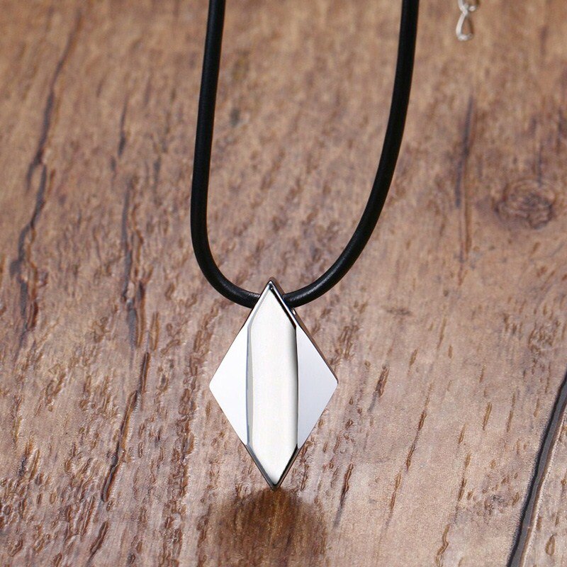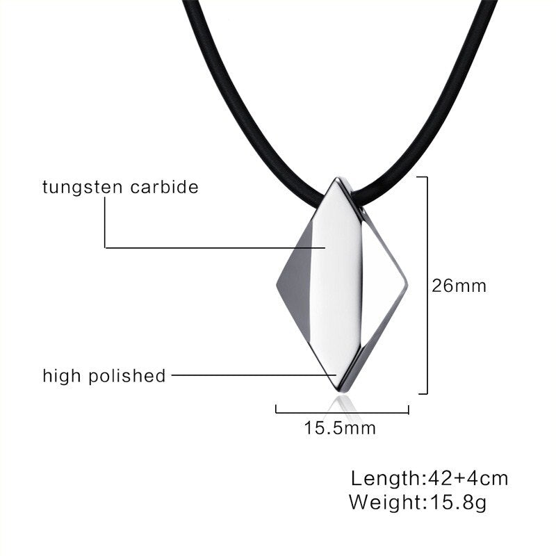 Tri-finish diamond shape men's tungsten pendant with highly reflective surfaces creating a very special gift or daily wear piece. Comes on a shorter rounded black rope necklace cord and will be sure to capture the attention of observers with it's beautifully polished sheen, which will not fade due to the nature of tungsten carbide.