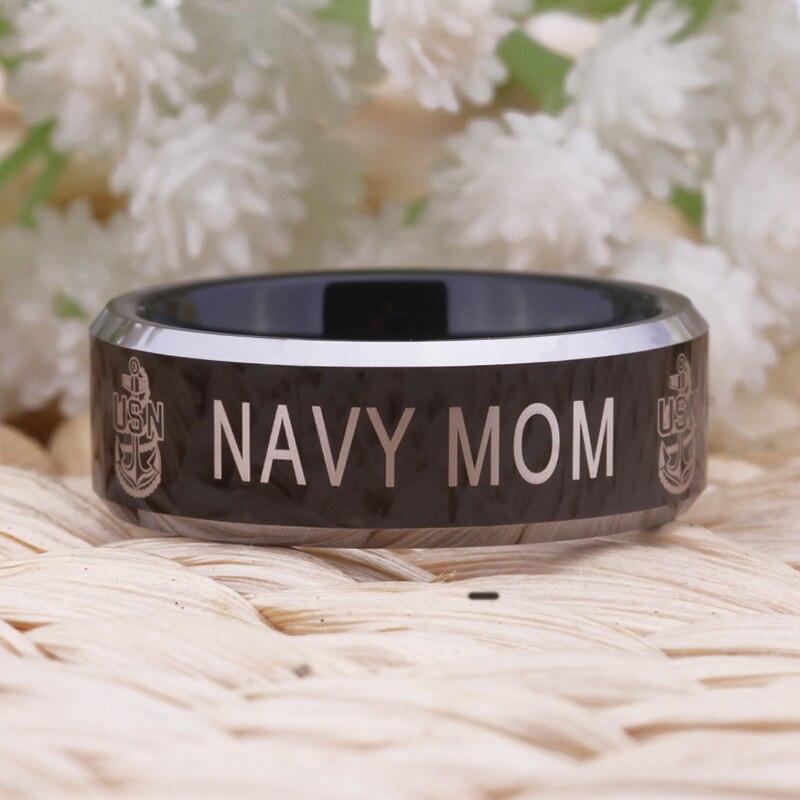 If you have a son in the Navy why not display your pride loud and proud with this gorgeous 'Navy Mom' ring. Crafted in black tungsten the ring is inscribed with the words navy mom and engraved with a naval symbol at its centre.