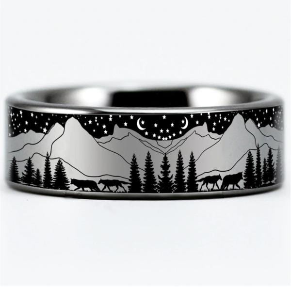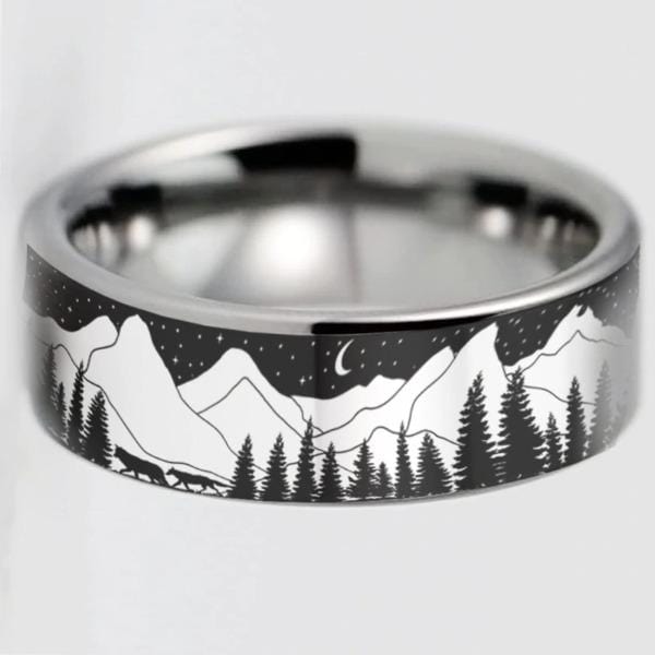 Dress to impress with this detailed forest wolf ring. The ring is made from tungsten carbide with a high polish silver border. The detailed band looks striking with a black, white and silver contrast and a gorgeous design.