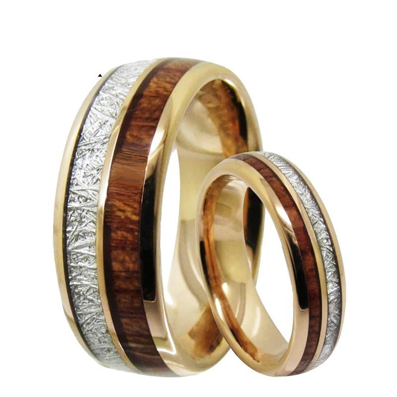 Wanting to add an earthy and natural touch to your big day? Say 'I Do' with this set of gold tungsten wedding bands. The bands both feature a stunning gold tungsten carbide outer with a deep warm mahogany wood inlay and silver texturing.