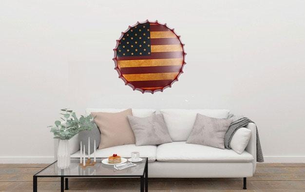 US Flag Print Beer Cap Metal Tin Sign Poster will adorn the look and feel of your wall. This versatile and durable tin sign, metal wall poster can be stuck in any corner of your room, office, shop, shed, garage or store and it will look just as great. Imported Iron. Fashion & Retro Quality Tinned Skin. Four pre-drilled holes for hanging or you may use double-sided tape.