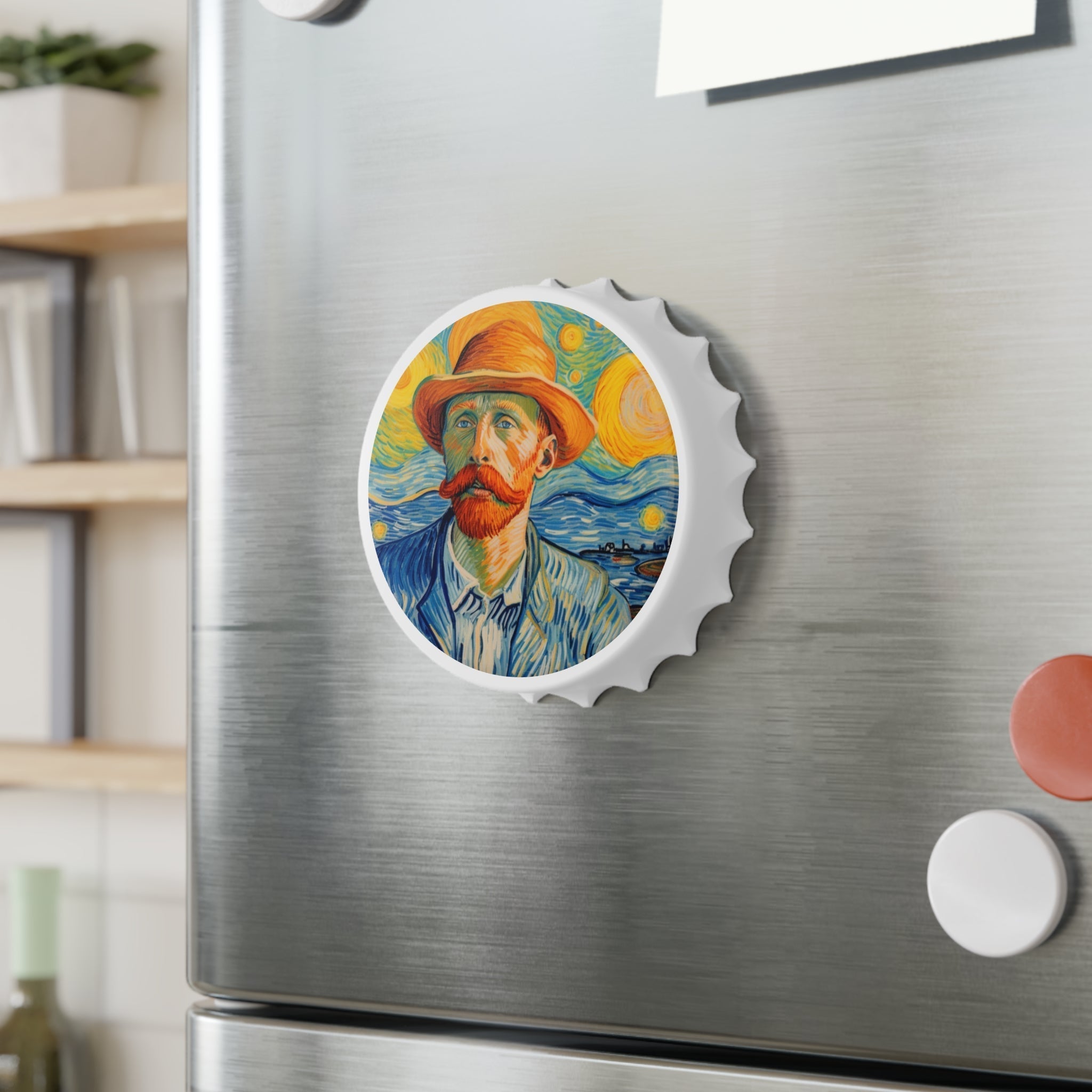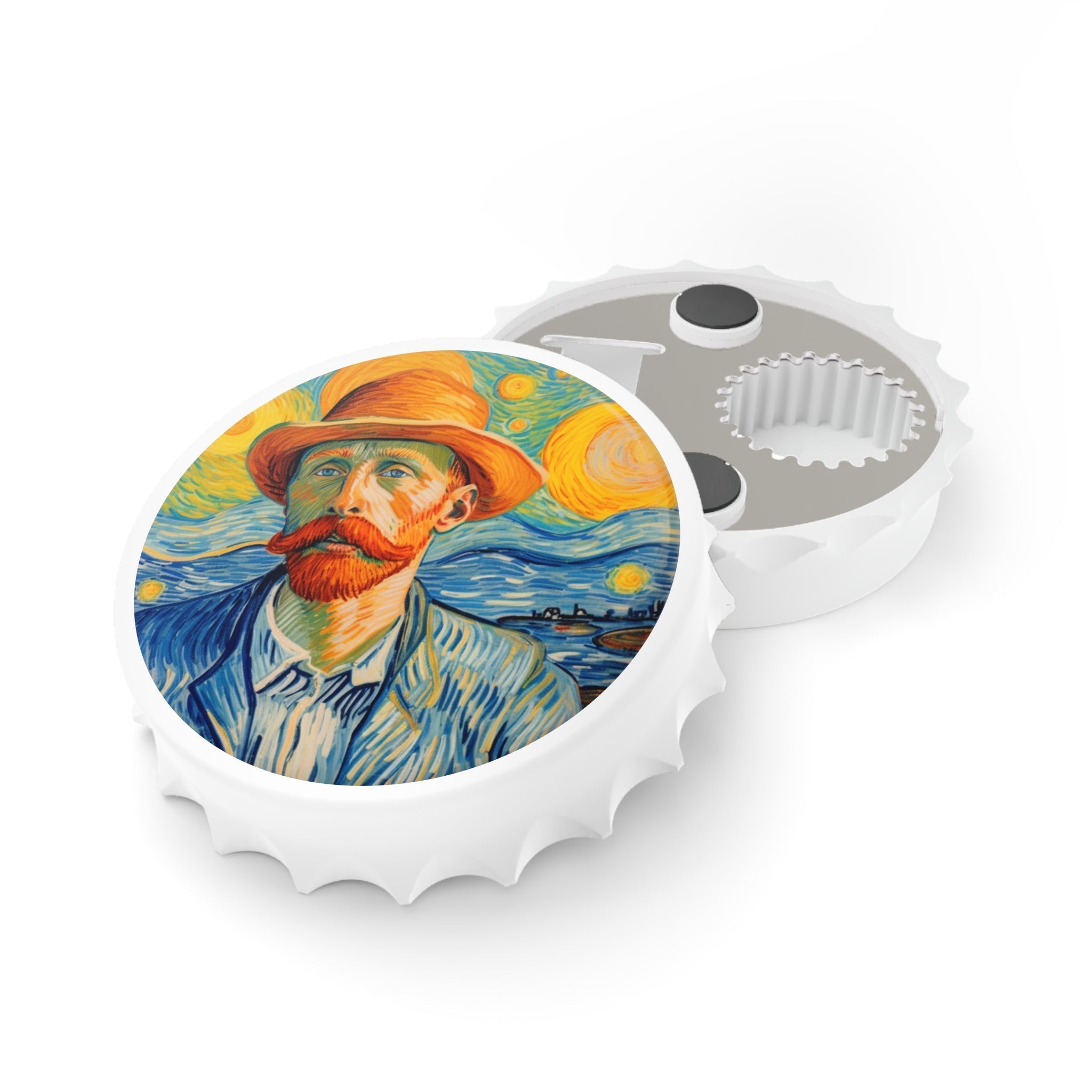 The magnet inside makes sure the cap stays put after you open the bottle, making it easier and faster to throw it away. This is especially helpful for people who find regular bottle openers hard to use. Create a versatile decor item that can be used both as a fridge magnet and a bottle opener. Design Inspired by of Portrait painting of van Gogh.