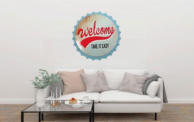 Welcome Take it Easy Beer Cap Metal Tin Sign Poster will adorn the look and feel of your wall. This versatile and durable tin sign, metal wall poster can be stuck in any corner of your room, office, shop, shed, garage or store and it will look just as great. Imported Iron. Fashion & Retro Quality Tinned Skin. Four pre-drilled holes for hanging or you may use double-sided tape.